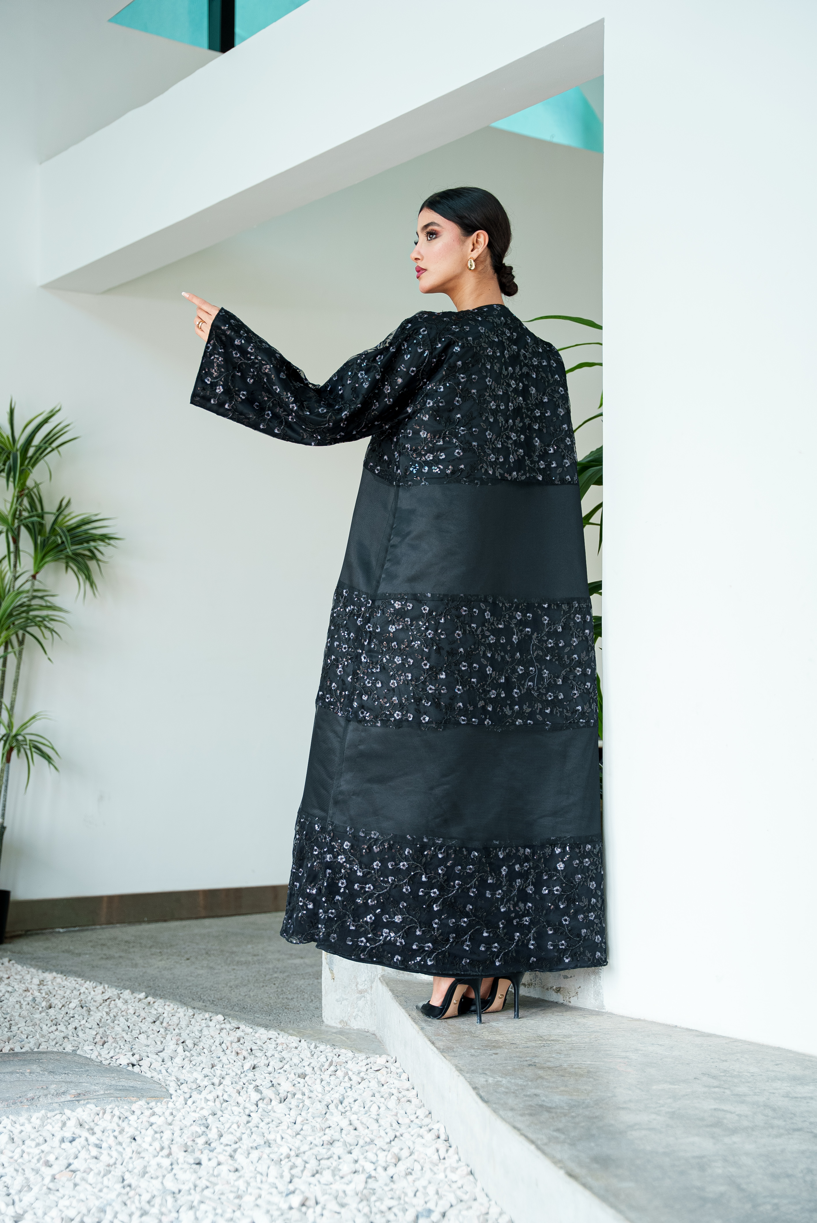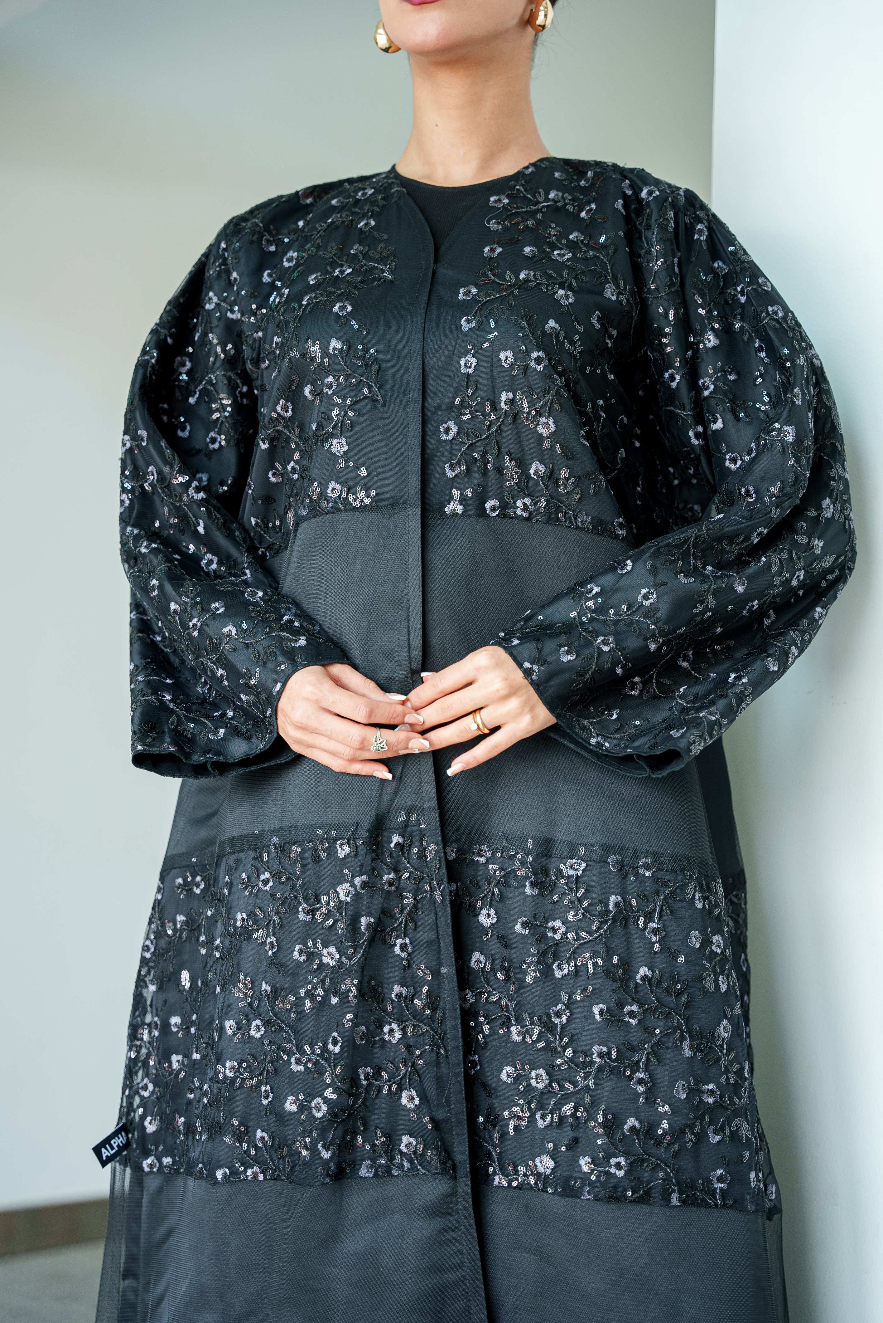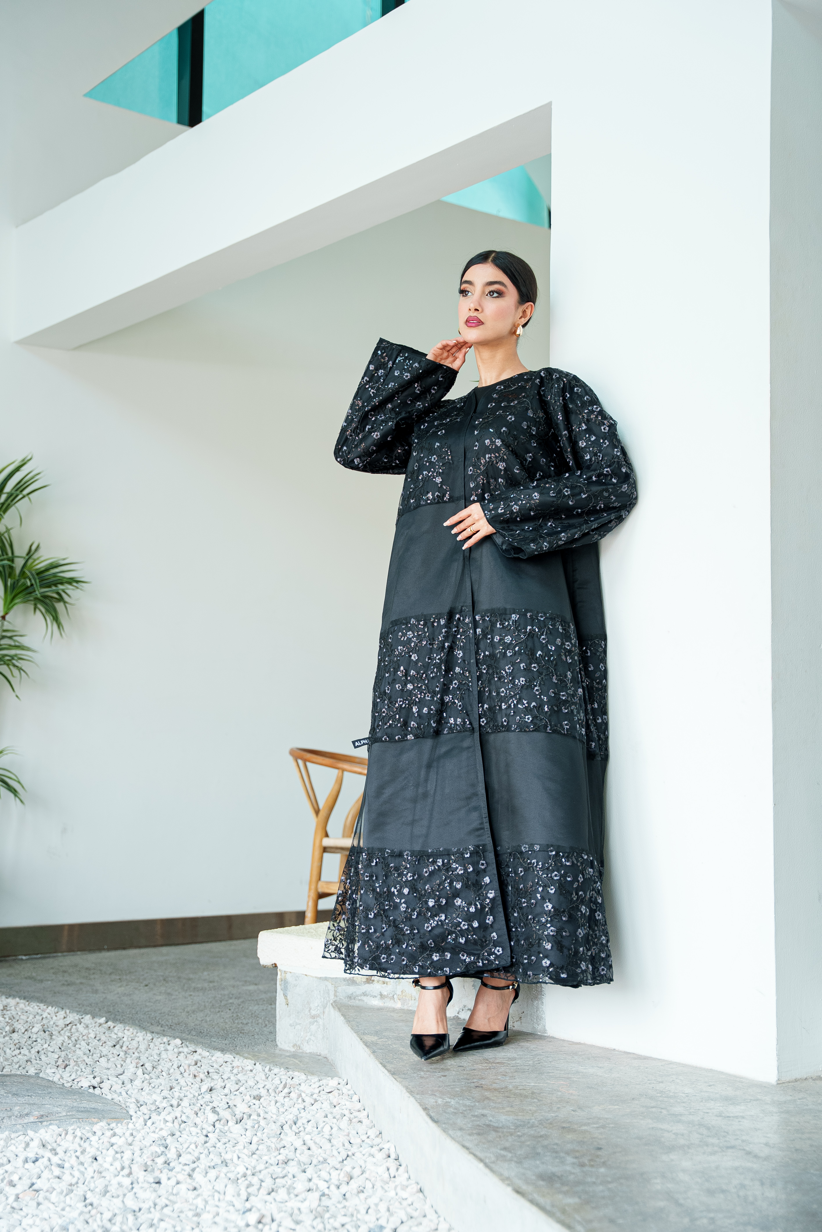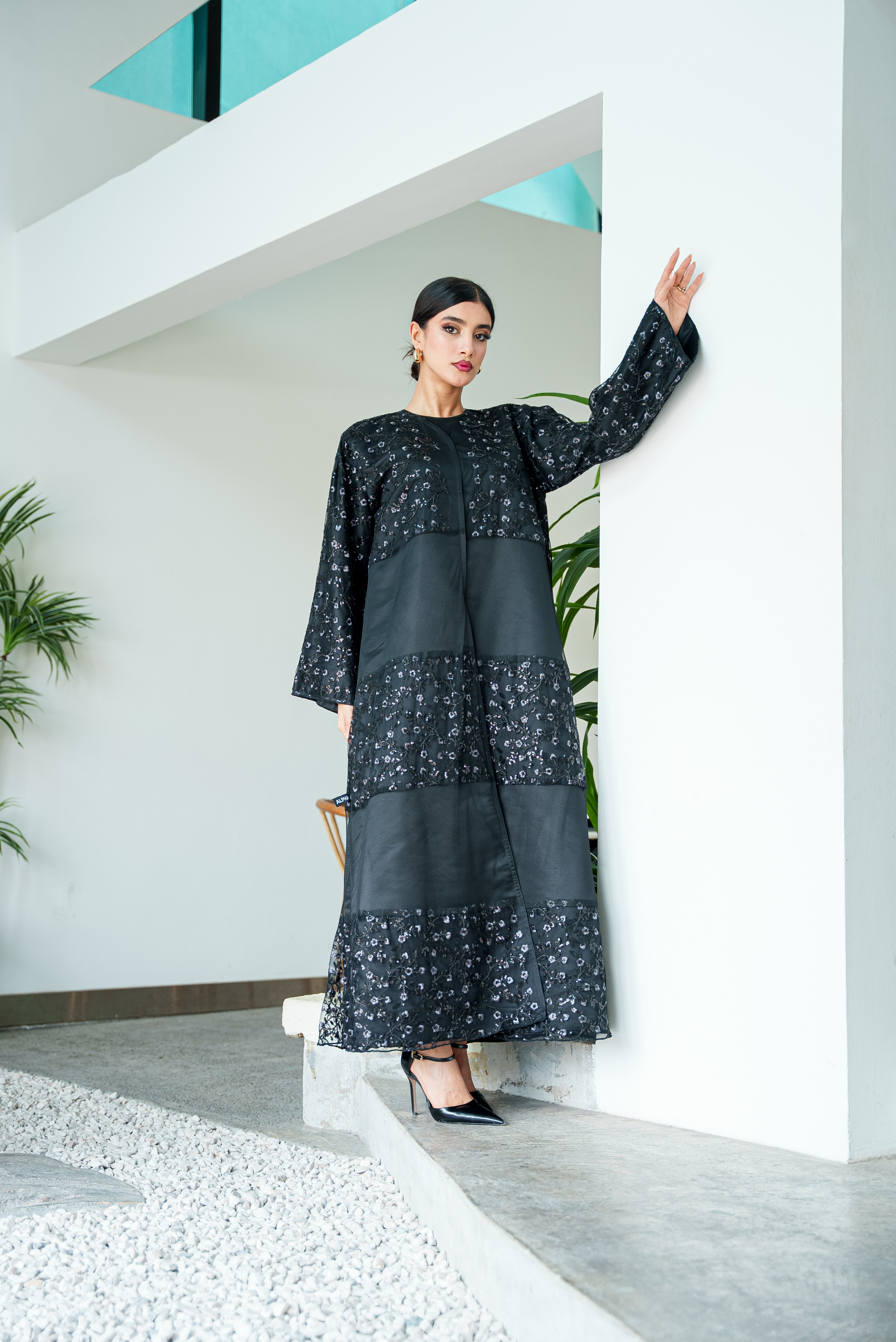تتميز العبايا بقماش حرير تكا مع قماش دانتيل منقش