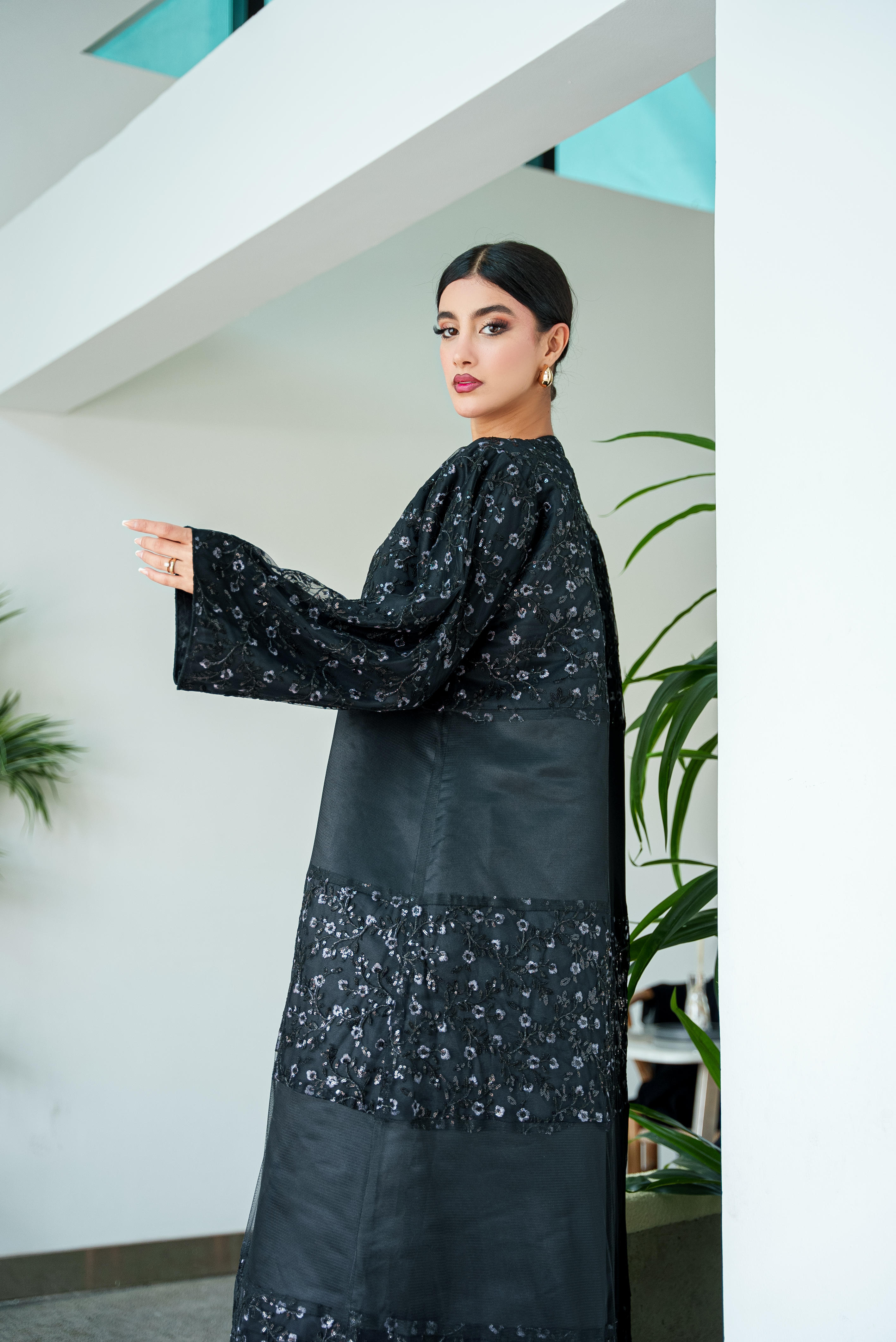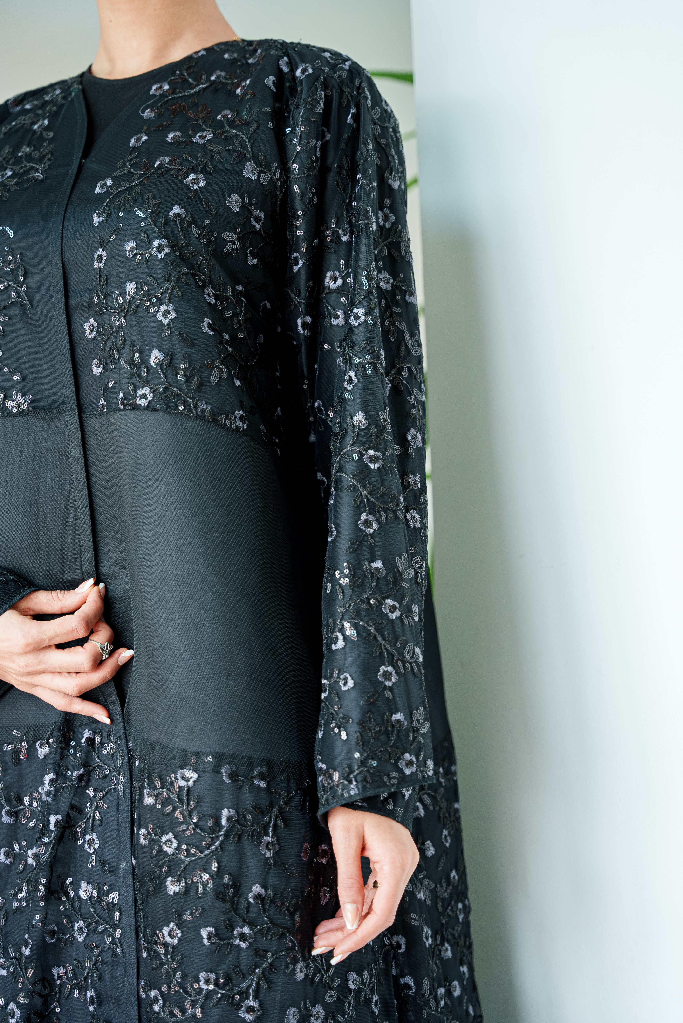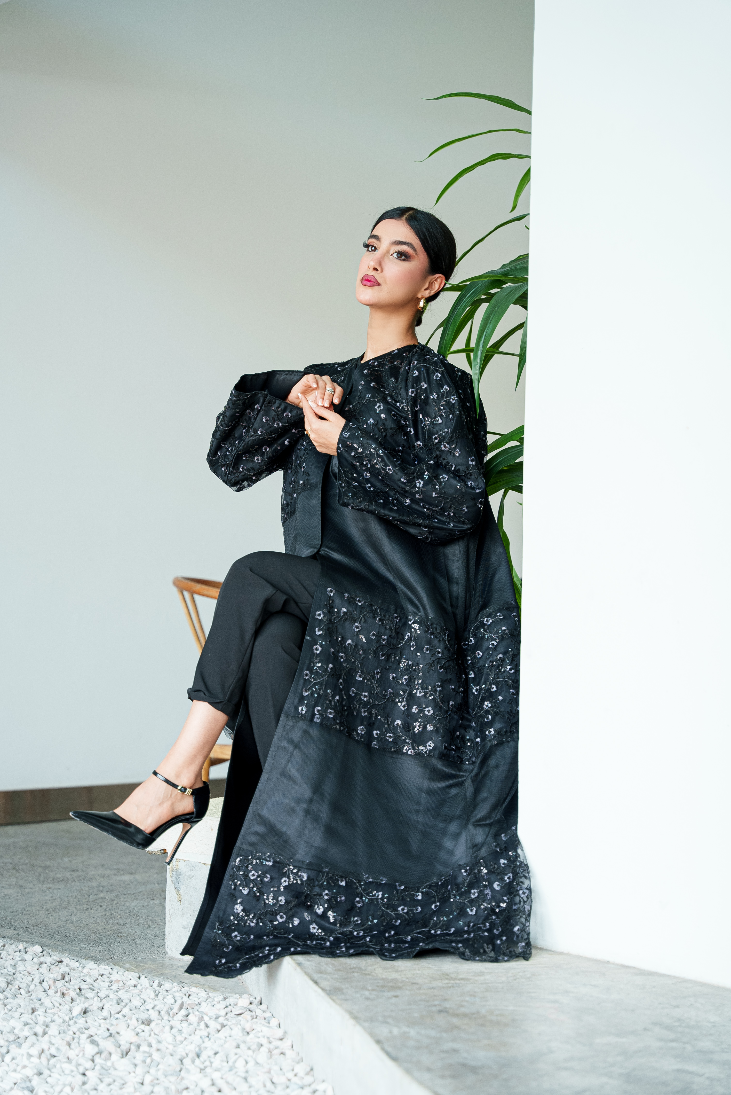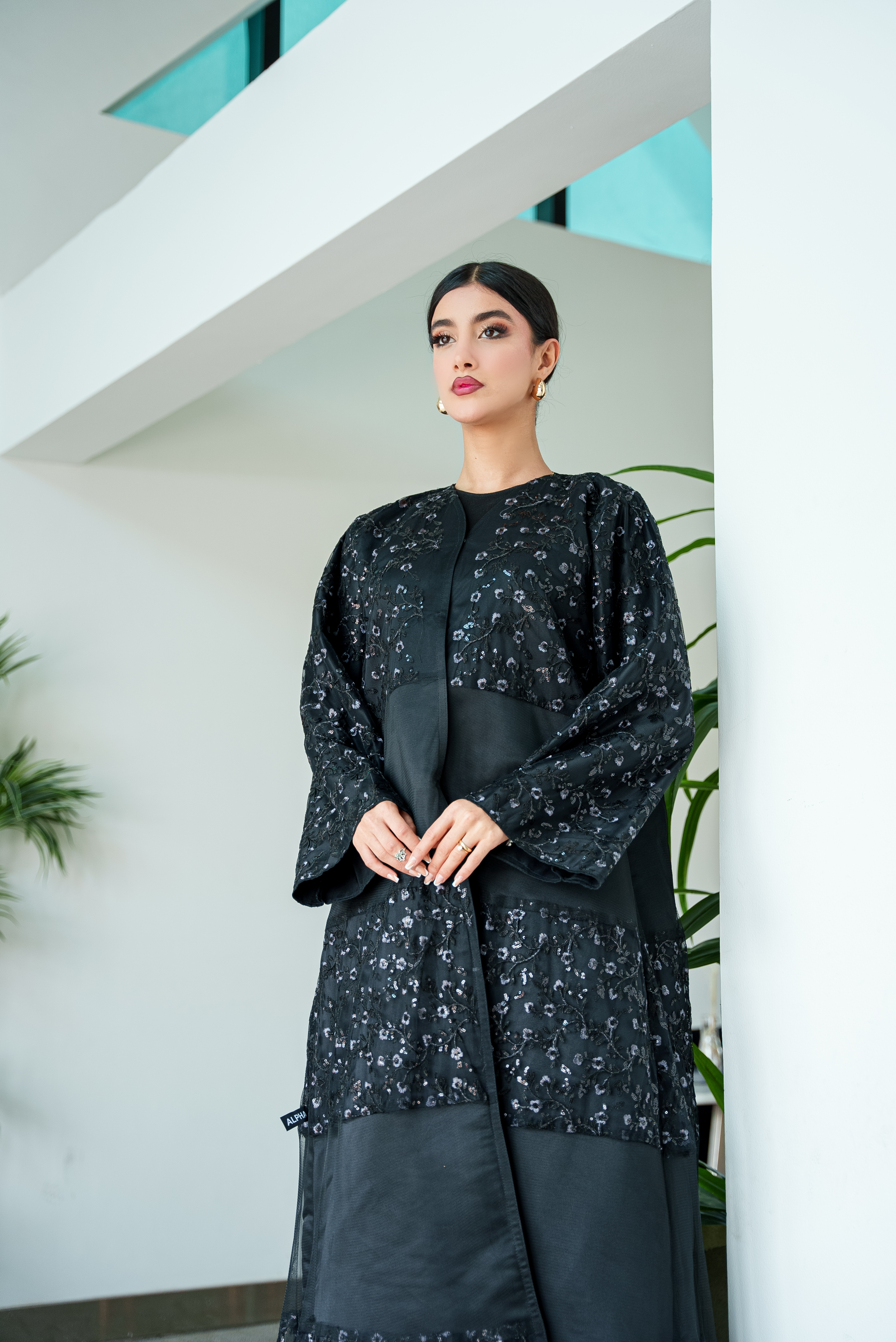 تتميز العبايا بقماش حرير تكا مع قماش دانتيل منقش